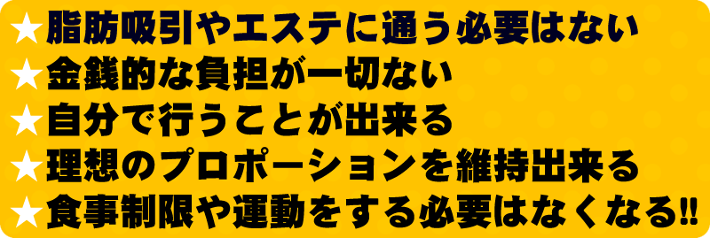 その数日後。気になっていたお腹周りのお肉がスッキリして、 1サイズ小さいジーンズがあっさり履けたのです! 彼女は、それまで断り続けていた、 水着撮影の仕事のオファーも受ける事ができるようになりました。 もちろん、食事制限や無理な運動は一切行っていません。 つまり事実上不可能とされていた 食事制限と運動をすることなく、ダイエットに成功できたのです! 通常ダイエットを成功させるには、食べたい物も食べずに我慢して、 運動でカロリー消費と筋肉の増強を行い、基礎代謝を上げて脂肪を燃焼させ、 体型を引き締めていくのが一般的です。 しかし、この『モデル痩身術』は一切の我慢や努力をすることなく、モデル体型になれるのです。 そして、この方法の素晴らしいところはまだあります。 いつでも、自分で行うことができるのにも関わらず、 まるで脂肪吸引やエステに通ったようなスタイルを手に入れることができるのです。 「脂肪吸引やエステの効果ってどのくらい?」って思うかも知れませんよね。 そこで脂肪吸引やエステの実態について少しお話しさせて頂きます。 脂肪吸引やエステでは理想のプロポーションを手に入れられない!?エステの痩身コースは、マッサージによる施術がメインです。実際にエステに通ったことの無い方でも、 テレビCMや広告などを見て知っていることでしょう。 ですが実際にエステを訪れてみると、 自宅での厳しい食事制限や運動プログラムがあり、 サプリメントやマッサージクリームなどの購入を迫られる事がほとんどなのです。 エステに通うのは週に2日〜3日ですが、 厳しい食事制限や運動は毎日続けなければなりません。 エステ通い、きっちりと決められた食事制限、運動プログラム、セルフマッサージを毎日続けるには、 どれだけの時間、努力、お金が必要なのでしょう。 誰にでもできるものではありません。 それでも理想のプロポーションが手に入るのなら良いのですが… エステの契約期間が終了すればどうなってしまうのでしょうか? 残念ながら、理想のプロポーションを維持する事はできません。