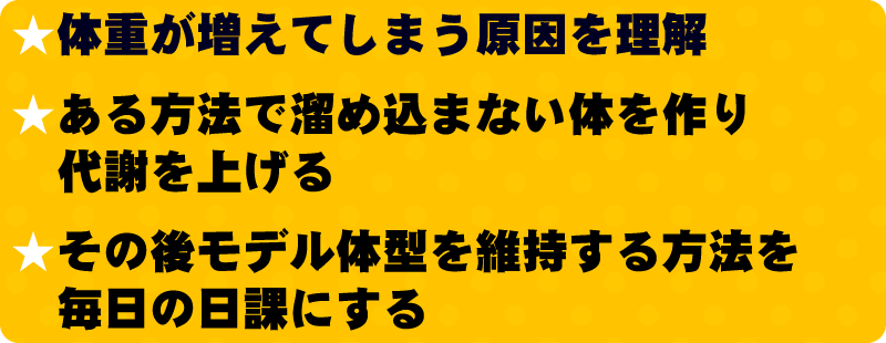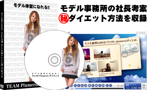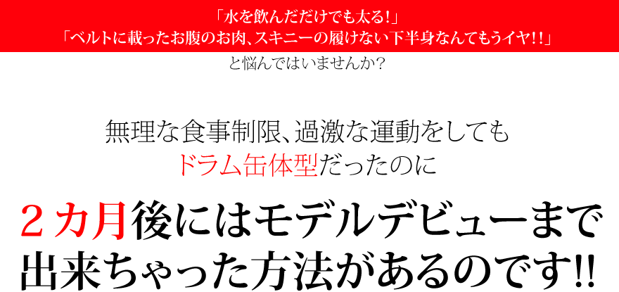 ここで、ダイエットのために食事制限が必要だからといって、食べるのを我慢する生活を続けても、 「食事を制限してるのに体重が思うように減らない。」 「自分の思い描くようなスタイルになれない。」 そして、更に無理な食事制限してしまい、最終的には、 いつも食べたい物を我慢しているストレスから、 食欲を自分でコントロールする事ができなくなり、 食事量がダイエット前に戻ってしまうのです。 結果、ダイエットを始める前の体重よりも増えてしまう・・・ それがリバウンドの原理なのです。 本来ならば、すでにモデル体型になっているはずのあなたの体を、 今のスタイルにしてしまったのは、他でもない、 あなた自身です! 理想体型を手に入れるために、頑張ってきた事が逆効果だったなんて、 とても悲しい事だと思います。 だからこそ、あなたにも正しい知識を得て頂き、 これからはモデルのような理想体型に近づいてもらいたいのです。 多くの方は、そういった正しい知識が無く、 あまり深く考えずに間違えた行動を繰り返しています。 正しい方法さえ知っていれば、自然とモデル体型は手に入るのです。 あなたもこの方法でモデル体型を手に入れませんか?「モデル体型は手に入れたいけれど…」確かに、自分でもできるのかな?…と不安に思うかもしれません。 しかし、ご安心下さい。 これまでに、数多くのモデルの卵をモデル体型へと導いてきた 『モデル痩身術』をお伝え致します。 この『モデル痩身術』は、何も難しくはありません。 誰にでもできる難しくない方法です。 大まかに言うと、たった3つの事をやって頂くだけです。 ![]() たったこれだけです。 これだけの事を実践して頂くだけで・・・ 気付いたら、体のラインが変化していることを実感するでしょう。 朝、何気なく履いたブーツのファスナーがスッと上がったり、 きつくて、しゃがむのが辛かったスキニーにゆとりが出ていたり、 洋服が綺麗に着こなせるようになったと感じる事でしょう。 では、具体的にどんな事をすればいいのでしょうか? はい、この方法をぜひ、直接あなたにお伝えしたいのですが、 私はモデル事務所の社長を務めており、事務所の運営や、モデル達の管理、 撮影の同行などで忙しく、直接お教えするには限界があります。 ですので、ダイエットでお悩みのあなたのために、 この『モデル痩身術』の秘密を全て初公開するDVDを製作致しました。 その一部を紹介すると…普通の女の子が2ヶ月でモデル体型になれちゃう秘密とは?
