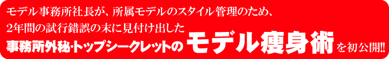 世の中には様々なダイエット方法がありますが、モデル体型になるための方法は無かったので、 『モデルのためのダイエット法』を確立しようと 2年以上にわたり様々な研究を重ね、 所属モデルに実践させて参りました。 私がこのサイトを立ち上げた理由は、とても簡単です。 プロポーションにコンプレックスを持っている人があまりにも多いからです。 そして、その人達に自分が望むプロポーションを手に入れて頂き、 自信を持って頂きたいからです。 「でもダイエットは結局、辛い食事制限と毎日の厳しい運動ですよね?」 なんて声が聞こえてきそうですが、心配はいりません。 モデル達も、食事制限や運動は続かず、結局次のような結論に至るのです。 「頻繁にエステに通わない限り、理想のスタイルは維持できない…」 「確実に痩せるためには脂肪吸引しかない…」 ですが、脂肪吸引やエステに通ったことによって、 無理なローン契約を結んでしまい、多額のローン返済が出来なくなり、 結果、借金地獄で苦しんでしまうのです。 現在、若い女性の自己破産が急増している背景には、 美容業界が少なからず絡んでいるのです・・・ さらに、施術の効果が思っていたようには得られなく、精神的に塞ぎ込んでしまった。 といった話もよく耳にしています。 一般的にダイエットで、理想のプロポーションを手に入れるためには、 食べたい物を我慢して…運動を頑張り続けるしかない…と。 そこで私は、「辛い食事制限と運動以外で、綺麗な体型を維持できる方法はないのか」 という課題を掲げ、モデル活動をしている頃から、 自分自身の体で試行錯誤を繰り返してきました。 世の中に出回っているダイエットやエクササイズを色々と試してみたり、 次々と紹介されるマッサージを施しても、内出血を起こしたり、 効果が得られなかったので、 脂肪燃焼成分、脂質の代謝、空腹感の仕組み、自律神経、生活習慣などにも着目して、 研究と実践を積み重ねてきました。 その試行錯誤が2年を過ぎようとした時、 私はあること≠ノ気が付いたのです。 その瞬間は「これだ!」と跳び上がったことを今でも憶えています。 そして、ドキドキしながら、 そのあること≠実際にダイエットで悩んでいるモデルに試してもらったのです。